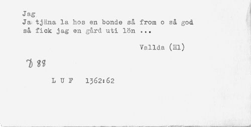 //// Ja tjäna la hos en bonde så from o så god //// så fick jag en gård uti lön ... //// Vällda (Hl) //// 1) %% //// LUF 1362:62 ////