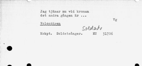 //// Jag tjänar nu vid kronan //// det andra gången är ... //// Vg //// Volontären //// Mskpt. Soldatsånger. EU 31706 //// 1 //// * ////