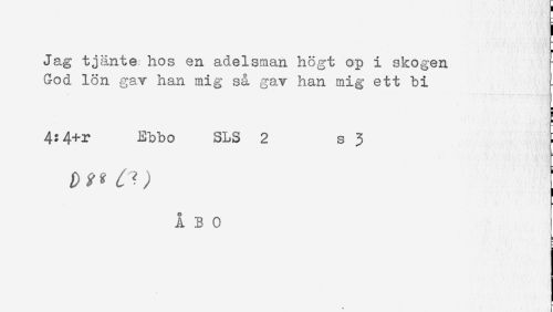 //// t //// Jag tjänte hos en adelsman högt op i skogen //// God lön gav han mig så gav han mig ett bi //// < //// < //// 4?4+r Ebbo SLS 2 s 3 //// ÅBO ////