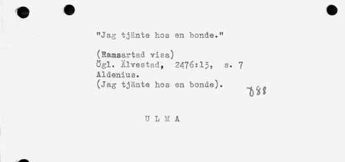 //// "Jag tjänte hos en bonde." //// (Ramsartad visa) //// Ögl. Älvestad, 2476:13, s. 7 //// Aldenius. //// (Jag tjänte hos en bonde). //// U L M A ////