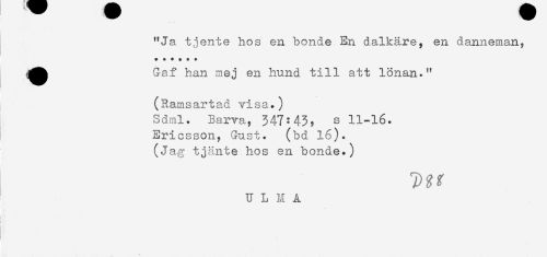 //// "Ja tjente hos en bonde En dalkäre, en danneman, //// *+*$ + + //// ^^ Gaf han mej en hund till att lönan." //// (Ramsartad visa.) //// Sdml. Barva, 347:43, s 11-16. //// Ericsson, Gust. (bd 16). //// (Jag tjänte hos en bonde.) //// U L N A ////