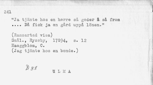 //// "Ja tjänte hos en herre så göder & så from //// .... Då fick ja en gård uppå lönen." //// (Ramsartad visa) //// Smål., Ryssby, 17S94, s. 12 //// Haeggblom, C. //// (Jag tjänte hos en bonde.) //// II L M A //// r //// . * ////