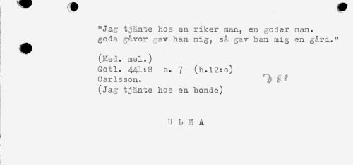 //// } //// i //// ! //// ! //// < //// t //// "Jag tjänte hos en riker man, en göder man. //// goda gåvor gav han mig, s& gav han mig en gård." //// { ^^^^^^ - //// (Med. mel.) //// I Gotl. 441:8 s. 7 (h.l2:o) //// Carlsson. ^ //// i (Jag tjänte hos en bonde) //// U L M A //// i //// i ////