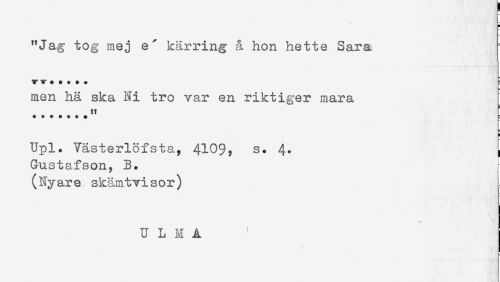 //// t ) — //// "Jag tog mej e^ kärring å hon hette Sara //// W * + + + + //// men hä ska Ni tro var en riktiger mara //// n //// Upl. Västerlöfsta, 4109, s. 4. i //// Gustafson, B. //// (Nyare skämtvisor) //// t ////