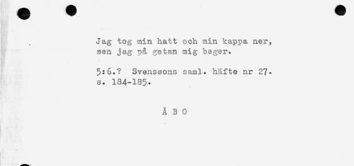 //// ^^^^ w * //// K ; //// Jag tog min hatt och min kappa ner, //// sen jag p& gatan mig beger. //// 5:6.? Svenssons saml. häfte nr 27* //// s. 184-185. //// ÅBO ////