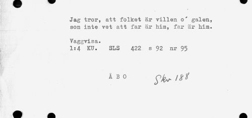 //// Jag tror, att folket år villen o^ galen, //// som inte vet att far är him, far är him. //// Vaggvi s a. //// 1:4' KU. SLS 422 s 92 nr 95 //// K i ////
