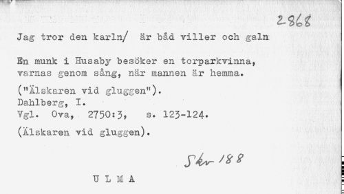 //// Jag tror den karln/ är bad viller och galn //// En munk i nusaby besöker en torparkvinna, //// varnas genom sång, när mannen är hemma. //// ("Älskaren vid gluggen"). //// Dahlberg, 1. //// Ygl. Ova, 2750:3? s. 123-124* //// (Älskaren vid gluggen). ////