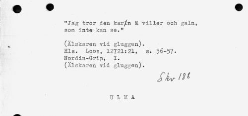 //// "Jag tror den kar/n ä viller och galn, //// som inte)kan se." //// (Älskaren vid gluggen). //// Hls. Loos, 12721:21, s. 56-57. //// Nordin-Grip, 1. //// (Älskaren vid gluggen). //// ^ A?' //// U L M A ////