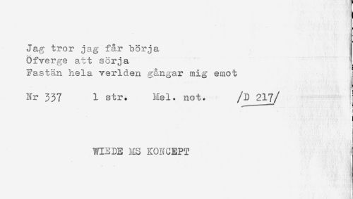 //// Jag tror jag får börja f //// Öfverge att sörja i //// Fastän hela verlden gångar mig emot //// Nr 337 1 str. Mel. not. /D 217/ j //// i //// ! //// WIEDE MS KONCEPT ////