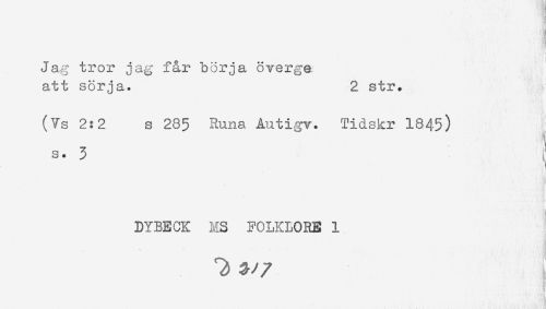 //// - //// Jag tror jag får börja överge //// att sörja. 2 str. //// (Vs 2:2 s 285 Runa Autigv. Tidskr 1845) //// i //// S. 3 ' //// DYBECK MS FOLKLORE 1 //// -t * //// T) ////
