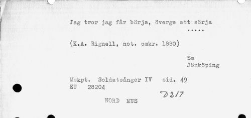 //// K * //// I 4'i' //// g //// Jag tror jag får börja^ överge att sörja //// ! //// ' ..... //// (K.A. Rignell, not. omkr. 1880) //// F '"' - ^ //// Sm //// Jönköping //// * //// Hskpt. Soldatsånger IV sid. 49 //// EU 28204 //// NORD MUS ////