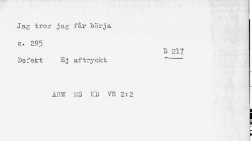 //// Jag tror jag f&r börja //// s. 285 //// D 217 //// Defekt Ej aftryckt //// ARW LIS KB VS 2:2 ////
