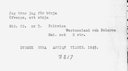//// H //// Jag tror jag får börja //// Ofverge, att sörja I //// H //// Sid. 22. nr 5. Folkvisa //// Westmanland och Dalarna - //// Mel. not 2 str. //// ) //// DYBECK RUNA ANTIQV TIDSKR. 1845- ////