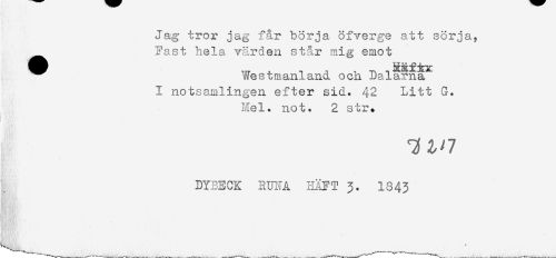 //// Jag tror jag f&r börja öfverge att sörja, //// __Fast hela vården står mig emot //// ^^ Westmaniand och Dalarna //// I notsamlingen efter sid. 42 Litt G. //// Mel. not. 2 str* //// DYBECK RUNA HAFT 3. I843 ////