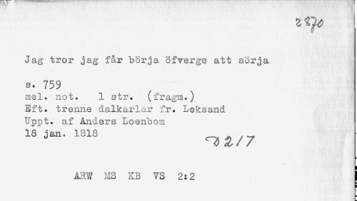//// Jag tror jag får börja öfverge att sörja //// s. 759 //// mel. not. 1 str. (fragm.) //// Eft. trenne dalkarlar fr. Leksand //// Uppt. af Anders Loenbom //// ISjan. 1318 ^^ //// ARW MS XB VS 2:2 //// H ////