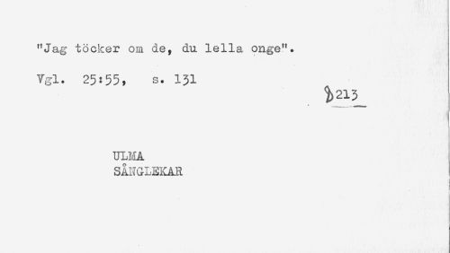 //// "Jag töcker om de, du lella onge". //// Vgl. 25:55, s. 131 //// 9)213 //// ? //// ULMA //// SÅNGLEKAR //// ! ////