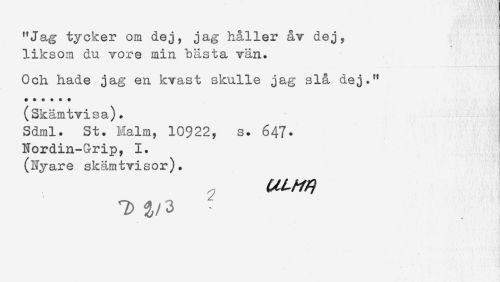 //// "Jag tycker om dej, jag håller åv dej, //// liksom du. vore min bästa vän. //// Och hade jag en kvast skulle jag sia dej." //// + + + ** + //// (Skämtvisa). //// Sdml. St. Halm, 10922, s. 647. //// Nordin-Grip, 1. //// (Nyare skämtvisor). //// T>%/3 ////