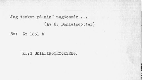 //// Jag tänker på min' ungdomsår ... //// (Av K. Danielsdotter) //// Se: Zz 1831 b //// KB:S SKILLINGTRYCKSREG. ////