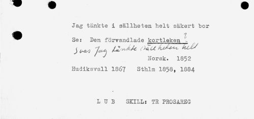 //// Jag tänkte i sällheten helt säkert bor //// ^^ Se: Den förvandlade kortleken ^ //// ^ Norsk. 1852 //// Hudiksvall 1867 Sthlm 1858, 1884 //// L U B SKILL: TR PROSAREG ////