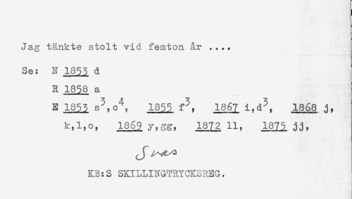 //// Jag tänkte stolt vid femton år .... //// Se: N 185^ d //// R 1358 a //// E 1855 1855 f^. I867 i.d^, 1868 .i. //// k,1,0, 1869 y.gg, 1872 11. 1875 .1.1, //// KB:S SKILLINGTRYCKSREG. ////