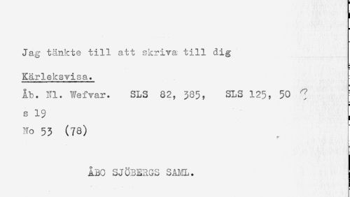 //// t //// Jag tänkte till att skriva till dig //// a //// Kärleksvisa. //// Åb. NI. Wefvar. SLS 82, 385, SLS 125, 50 ^ //// s 19 ^ //// No 53 (78) //// T** //// ÅBO SJÖBERGS SAML. ////