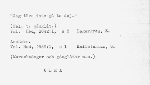 //// "Jag törs inte gå te dej." //// (Mel. t. gånglåt.) //// Vml. Hed? 2832:1, s 8 Lagergren, E. //// 'Anmärkn. //// Vml. Hed, 2868:1, s 1 Kallstenius, G. //// (Marschsånger och gånglåtar m.m.) //// U L M A //// ' . ! 'J ////