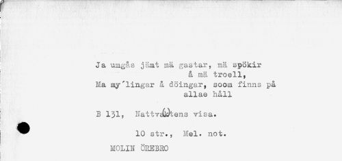 //// j //// Ja umgås jämt mä gastar, mä spökir //// å mä troell, //// Ha my'lingar å döingar, soom finns på //// allae håll //// i B 131. Nattv^tens visa. //// < //// ^^ 10 str.. Hel. not. //// MOLIN ÖREBRO ////