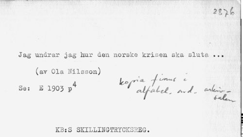 //// Jag undrar jag hur den norske krisen ska sluta ... //// (av Ola Nilsson) //// Se: E 1903 p^ //// / //// ! //// s //// KB:S SKILLINGTRYCKSREG. j ////