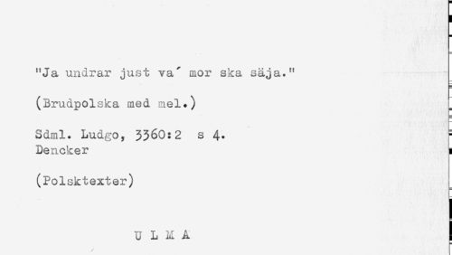 //// "Ja undrar just va' mor ska säja." //// (Brudpolska, med mel.) //// Sdml. Ludgo, 3360:2 s 4. ^ //// Dencker L //// (Polsktexter) //// U L M A ! ////