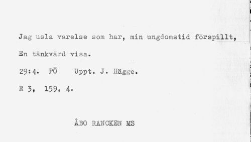//// [ //// Jag usla varelse som har, min ungdomstid förspillt, //// \ //// En tänkvärd visa. //// 29:4- PÖ Uppt. J. Hägge. [ //// R 3, 159. 4- ! //// t //// ÅBO RAI^CKEN MS ////