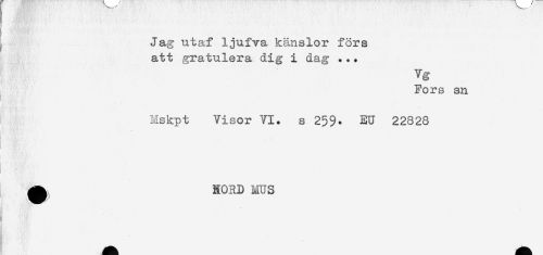 //// .' ' - '' //// y' 1." * - Wtr '* ' . * ) ' < ' //// . Jag utaf ljufva känslor förs //// att gratulera dig i dag ... //// Yg //// < //// Fors sn //// Mskpt Visor VI. s 259. EU 22828 //// ^ NORD MUS //// K '. * - * * //// !' * -f- //// g.: .. .98'' - ////