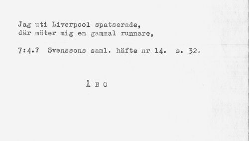 //// Jag uti Liverpool spatserade, //// där möter mig en gammal runnare, //// 7:4.? Svenssons saml. häfte nr 14. s* 32. //// ÅBO ////