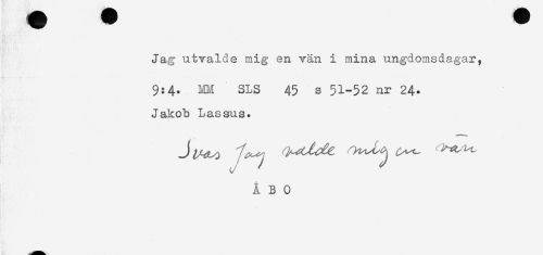 //// Jag utvalde mig en vän i mina ungdomsdagar, //// 9:4. MM SLS 45 s 51-52 nr 24. //// Jakob Las sus. //// ÅBO ////