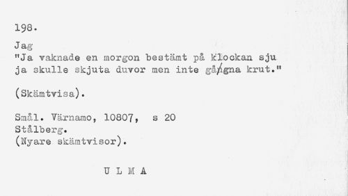 //// 1$8. //// Jag //// "Ja vaknade en morgon bestämt p& klockan sju //// ja skulle skjuta duvor men inte gångna krut." //// (Skämtvisa). //// Smål. Värnamo, 10807, s 20 //// Stålberg. //// (Nyare skämtvisor). //// U L M A //// * < ////