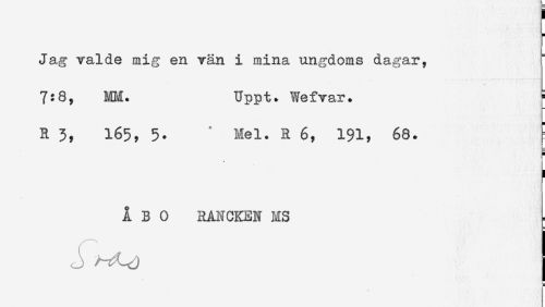 //// H //// Jag valde mig en vän i mina ungdoms dagar, //// 7:8, MM. Uppt. Wefvar. //// R 3, 165? 5. ' Mel. R 6, 191? 68. ' //// i //// * //// ! //// ÅBO RAIs[CKEN MS //// j ^Lj j ////