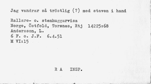 //// Jag vandrar sa tröstlig (?) med staven i hand //// Rallare- o. stenhuggarvisa //// Norge, Östfold, Torsnes, Rtj 14225:68 //// Andersson, L. i //// 6 F. o. J.F. 6.4.51 ^ //// H VI:15 //// < //// i //// R A INSP. ////