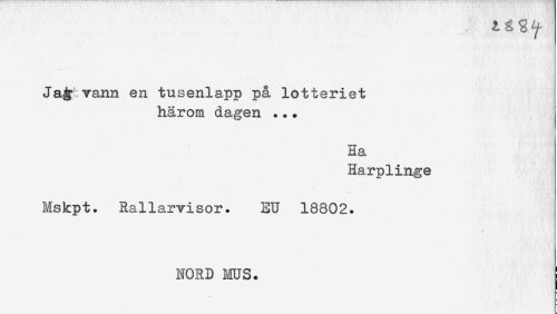 //// Ja# vann en tusenlapp på lotteriet //// härom dagen ... //// 3a //// Harplinge //// Mskpt. Rallarvisor. EU 18802. //// NORD ms. j ////