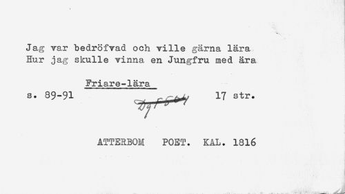 //// Jag var bedröfvad och ville gärna lära //// Hur jag skulle vinna en Jungfru med ära //// Friare-lära //// S. 89-91 / j ^ ^ //// ATTERBOM POET. KAL. 1816 ////