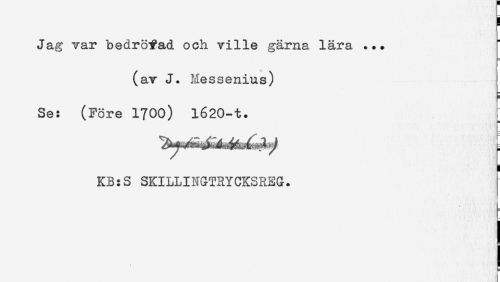 //// Jag var bedröfad och ville gärna lära ... //// (av J. Messenius) //// Se: (Före 1700) l620-t. ; //// < //// KB:S SKILLINGTRYCKSREG. //// - ////