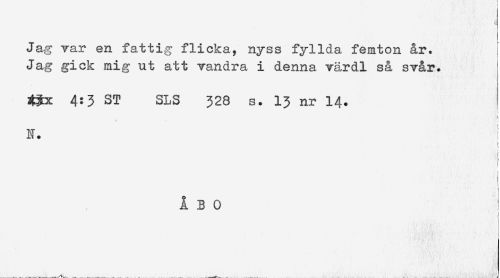 //// Jag var en fattig flicka, nyss fyllda femton &r. //// Jag gick mig ut att vandra i denna värdl så svår. //// 4:3 ST SLS 328 s. 13 nr 14. //// } //// i //// * ^ //// N. : //// i //// * //// < //// ÅBO //// t ////