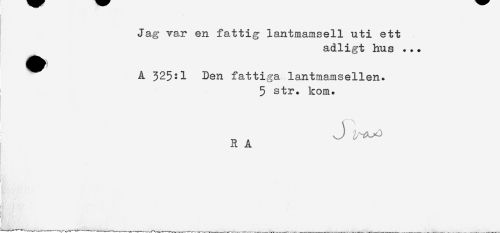 //// I //// Jag var en fattig lantmamsell uti ett //// adligt hus ... //// A 325:1 Den fattiga lantmamsellen. //// 5 str. kom. //// . //// J ^L-a //// R A //// - //// ] ////