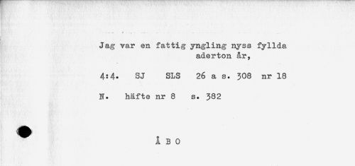 //// - - ^ - ......- - ... //// ) . //// Jag var en fattig yngling nyss fyllda //// aderton ar, //// 4:4. SJ SLS 26 a s. 308 nr 18 //// N. häfte nr 8 s. 382 //// ! ////