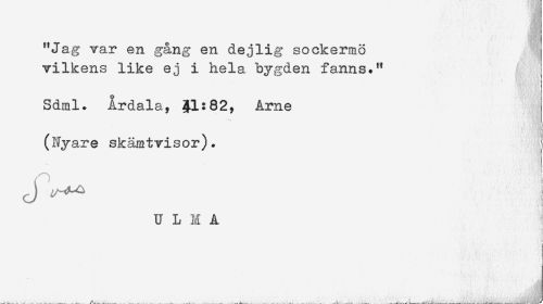 //// å //// "Jag var en gång en dejlig sockermö //// vilkens like ej i hela bygden fanns." //// Sdml. Årdala, $1:82, Arne //// (Nyare skämtvisor). //// J ^ ! //// u L n A ////