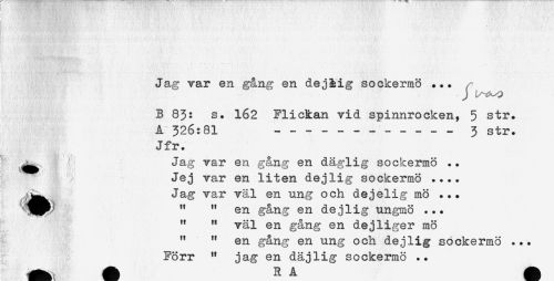 //// Jag var en gång en dej&ig sockermö ..• //// J lA*^ //// B 83: s. 162 Flickan vid spinnrocken, 5 str. //// A"326:81 ---3 str. //// Jfr. //// ' ' Jag rar en gång en daglig sockermö • . //// Jej Tar en liten dejlig sockermö ... Jag var Täl en ung och dejelig mö ? "mjfi w " en gång en dejlig ungmö ... //// w w väl en gång en dejliger mö Ä M en gång en ung och dejlig sockermö ... Förr 11 jag en däjlig sockermö .. //// ^ A HA A ////