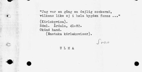 //// "Jag Tar en gång en dejlig sockermö, fs<; vilkens like ej i hela bygden fanns .. ?" //// (Kärleksvisa). Sdrnl. Årdala, 41:82. Okänd hand. //// (Enstaka kärleksvisor). //// jl^ J ircoo //// U L I A ////