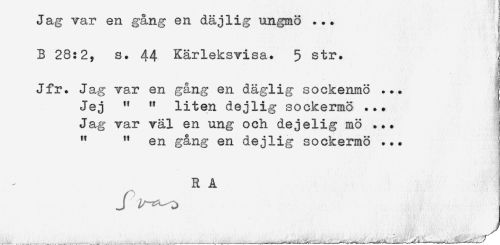 //// Jag var en gång en däjlig ungmö .. . B 28:2, s. 44 Kärleksvisa. 5 str. //// I //// Jfr. Jag Tar en gång en daglig sockenmö ... j //// Jej M rt liten dejlig sockermö ... I //// Jag Tar väl en ung och dejelig mö ... " 11 en gång en dejlig sockermö ... //// J //// ... J //// ...M...,...^___^.l ... , .,, C^J., ___---A: r^^y ////