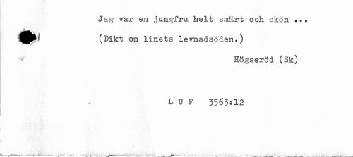 //// Ja g Tar en jungfru helt smärt och skön. ••• //// k //// ^PP' (Dikt om linets levnadsöden*) //// Högseröd (Sk) //// L U P 3565:12 ////
