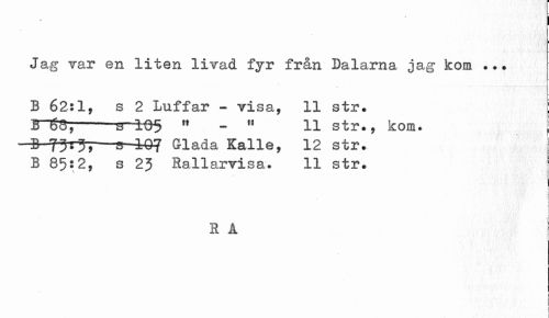 //// t //// Jag var en liten livad fyr från Dalarna jag kom ... //// B 62:1, s 2 Luffar - visa, 11 str. //// -sr-i.05 ft - « 11 str., kom. j //// B 730»-15-40? Glada Kalle, 12 str. //// B 85*2, s 2J Hallarvisa. 11 str. //// i //// a å j //// ' • " ' ' ' i J ////