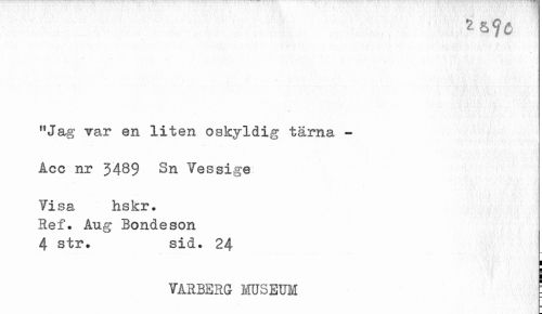 //// i&<}ö //// "Jag var en liten oskyldig tärna - //// Åcc nr 3489 3n Vessige //// Vi S St faskr. Hef. Aug Bondeson 4 str. sid. 24 //// yårberg museum ; ////