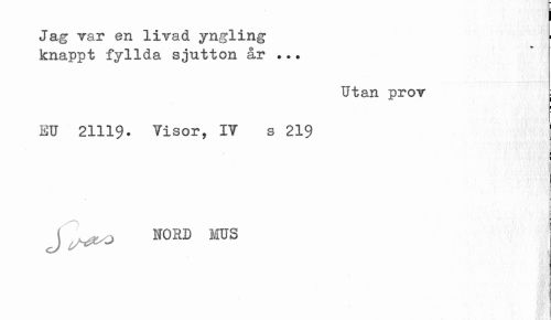 //// I //// Jag Tar en livad yngling knappt fyllda sjutton år .. • //// Utan prov = //// i //// EU 21119. Visor, IV s 219 //// | //// J ^k^O HO HD MUS ////